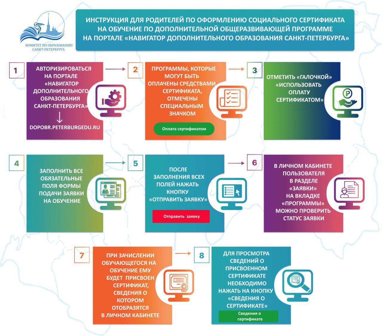 В рамках персонифицированного финансирования дополнительного образования детей в Санкт-Петербурге, 69 образовательными учреждениями (61 ГБОУ, 3 ГБДОУ, 5 ГБУ ДО) Невского района создано 148 краткосрочных программ дополнительного образования (12 часов), которые вошли в реестр сертифицированных программ Санкт-Петербурга. Для записи на указанные программы родители обучающихся (в возрасте от 5 до 18 лет) должны получить на портале государственных услуг бесплатный сертификат на оплату обучения за счет средств бюджета Санкт-Петербурга и прикрепить сертификат в ИС "Навигатор ДО" к выбранной программе.